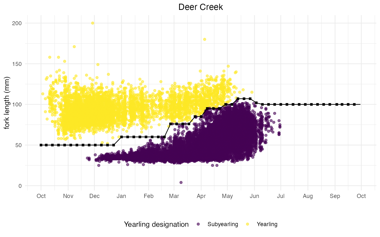 FlowWest shared above plot for each watershed and asked stream experts to review. We incorporated feedback and modified rulesets to better separate yearlings and YOY.