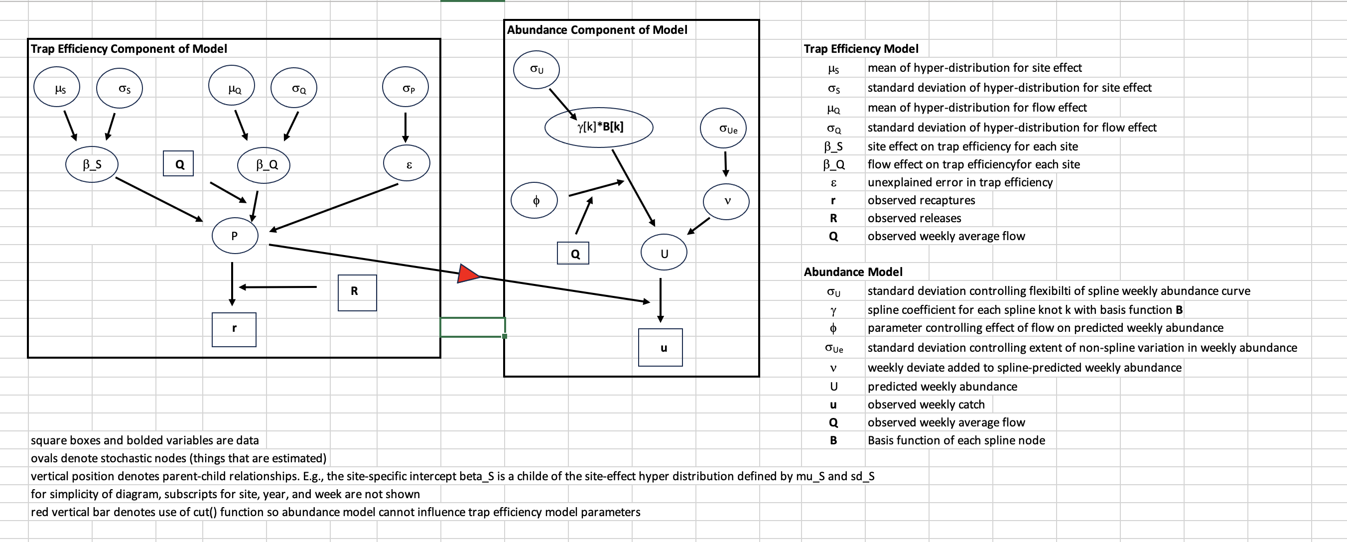 The input data for the model includes weekly catch ( in Figure 2 below), trap efficiency data (releases and recaptures ), and weekly average flow ). The model outputs weekly estimates of abundance and uncertainty and weekly estimates of trap efficiency and uncertainty. Length frequency data for each week is required if calculating abundance by run type in a post-processing step using the PLAD model.